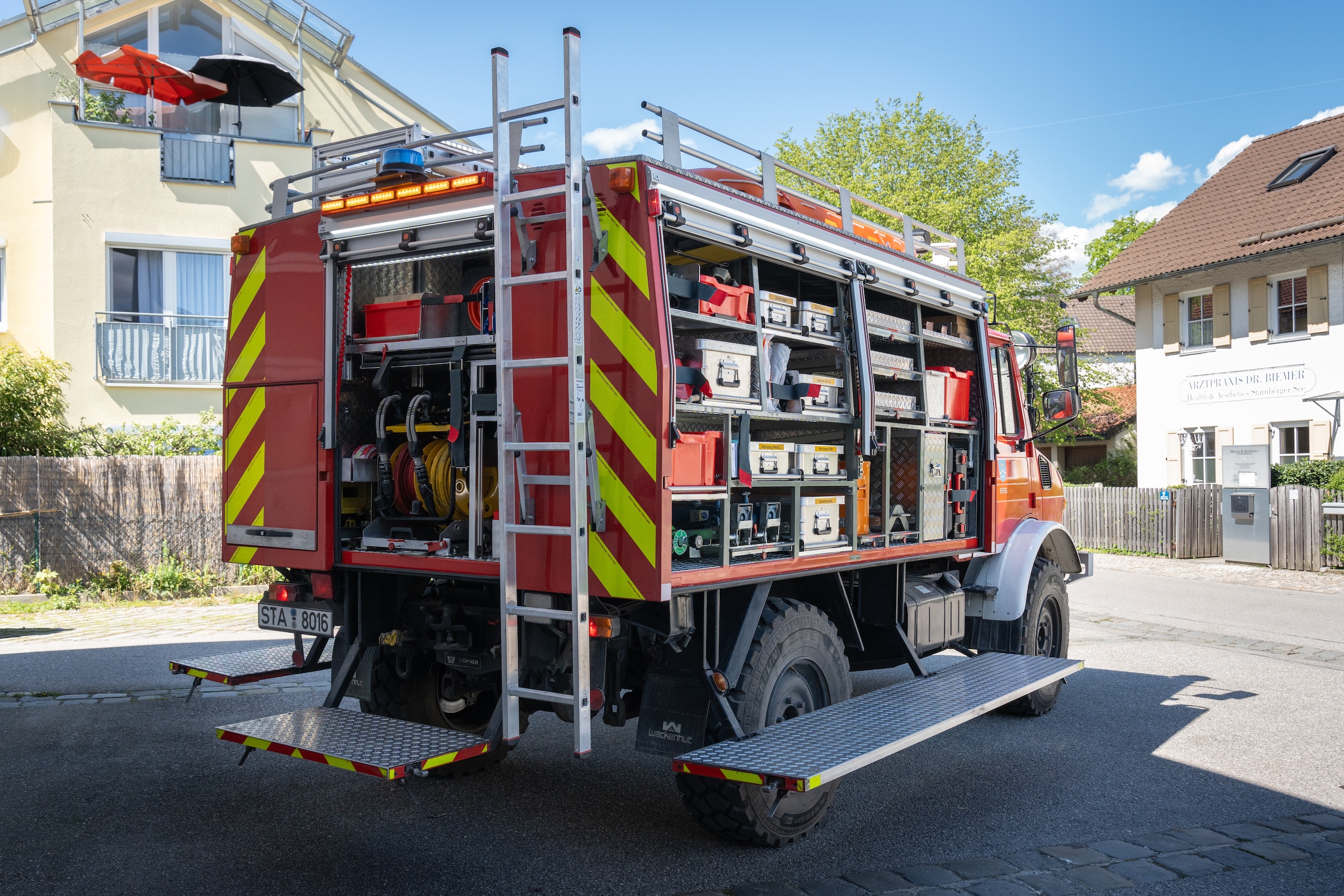 Die für die Seilwinde passenden Anschlagmittel und eine Umlenkrolle sind ebenso im Aufbau untergebracht, wie Abstütz- und Unterbaumaterial, Hebekissen, Beleuchtungsmaterial, Sägen, Trennschleifer und umfangreiches Werkzeug. Auch ein Satz “rollbarer Wagenheber” ist neu untergebracht, mit dem im Ernstfall geparkte PKW nur durch Muskelkraft beschädigungsfrei versetzt werden können, um beispielsweise den Zugang zu Hydranten zu ermöglichen.