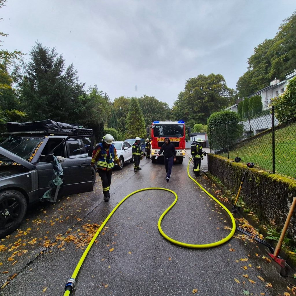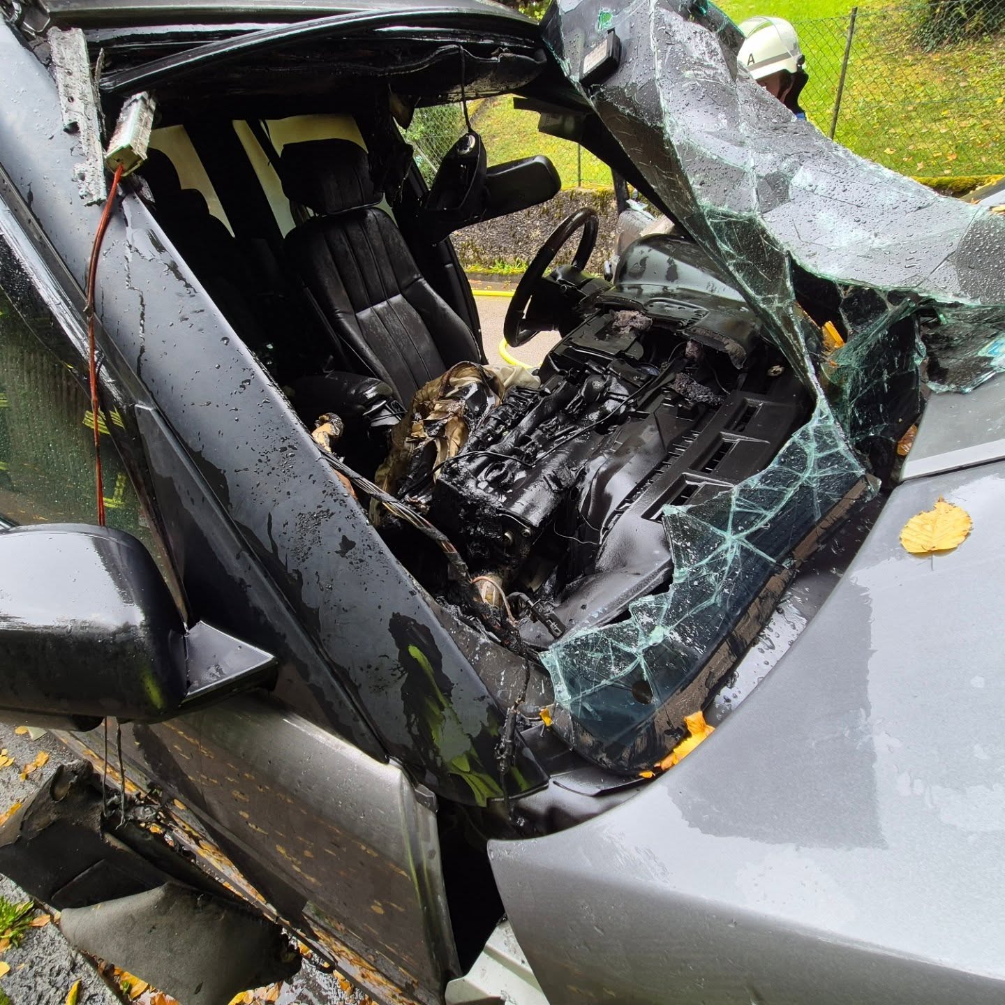 Da sich die Türen nicht öffnen ließen, verschaffte sich ein Atemschutztrupp über die teils schwarz-folierten Verbundglasfenster Zugang zum Innenraum. Im Fahrzeug befanden sich keine Personen.